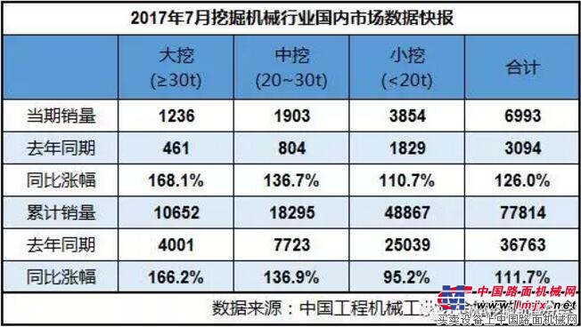 根据中国工程机械工业协会挖掘机械分会行业统计数据,2017年1—7月纳入统计的25家主机制造企业,共计销售各类挖掘机械产品82725台,同比涨幅101.3%。国内市场销量(不含港澳台)77814台,同比涨幅111.7%。出口销量4884台,同比涨幅14.0%。